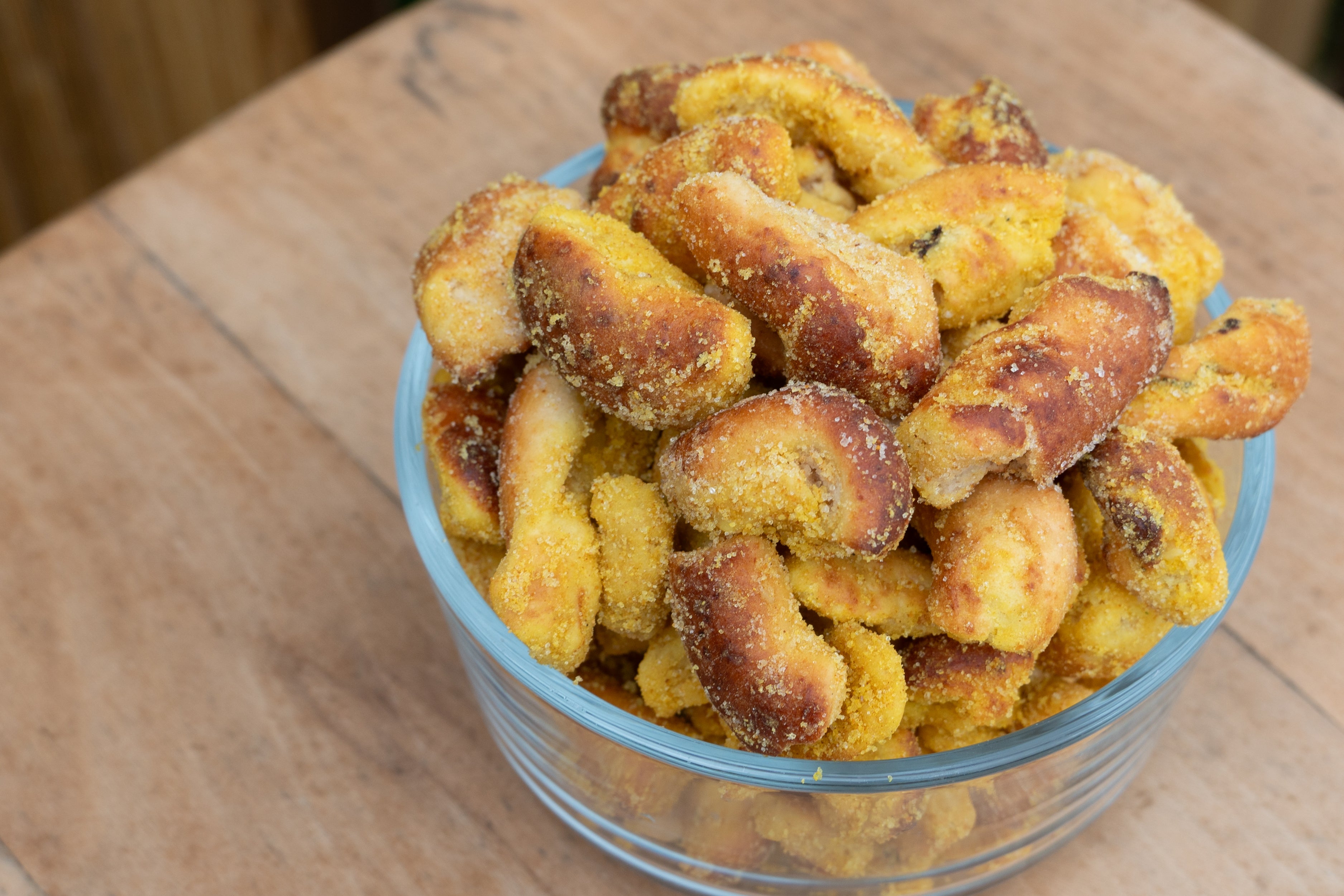 These pretzel bites are fresh from our small town Wisconsin kitchen, made by our family for yours. We start with our special sourdough recipe and get it bubblin' just right. Then we grab a pile of delicious Wisconsin cheddar cheese curds — they're made just down the road and delivered fresh almost every day. Resisting the temptation to eat every squeaky curd then and there, we mix that delicious cheddar right into the sourdough. We hand-twist each pretzel, bake just so, salt to perfection, and carefully crumble to create our unique snack bites.